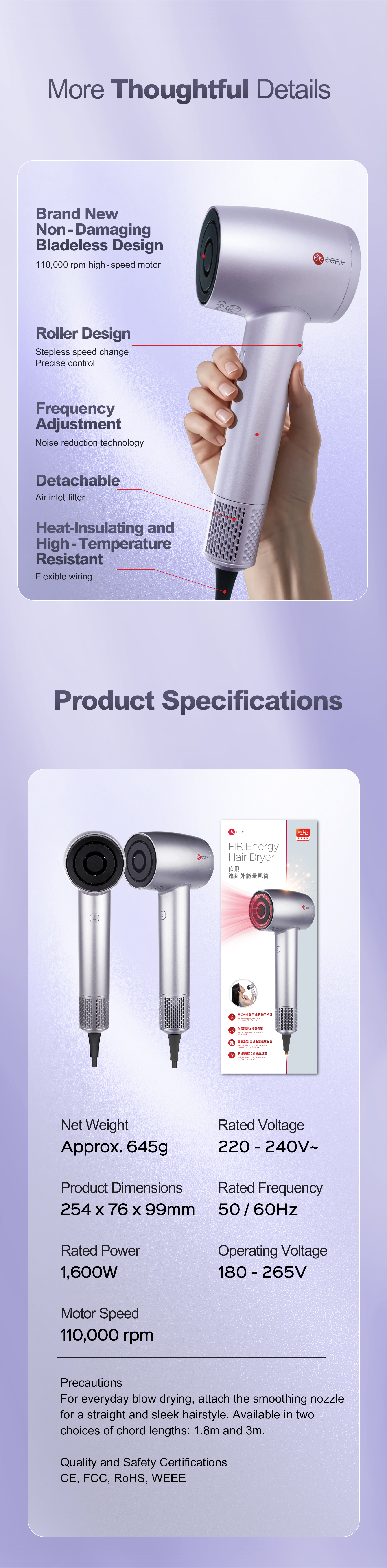 Processed by eefit’s patented technology, this product improves blood microcirculation in your body. Equipped with up to 20 levels of ultra-fine wind speeds, this product is suitable for the whole family. Specially designed with a step-less roller, the Hair Dryer enables quick and precise wind speed adjustment. The combination of eefit’s far-infrared technology and negative ions technology provides dual care benefits. The 110,000 RPM high-speed brushless motor dries your hair rapidly. You can switch between cold, warm, and hot air with a single press. Efficiently combining multiple functions, it can achieve various hair-revitalizing and drying effects.