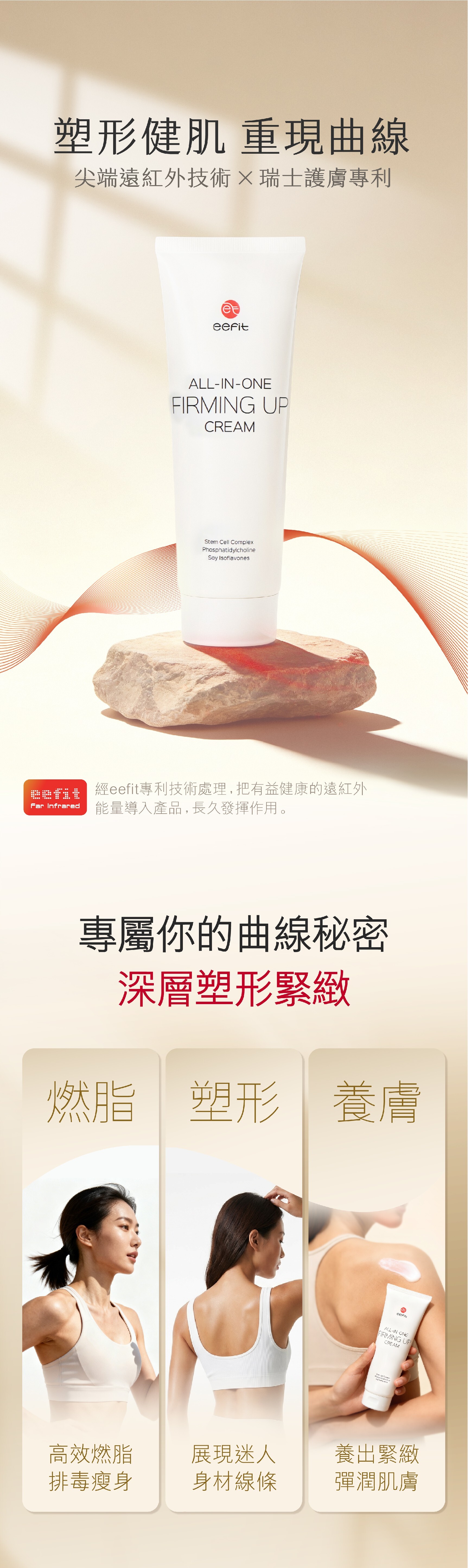 經過eefit專利技術處理,結合瑞士靶向科研技術及三種專業高效成份,針對性撃走頑固脂肪,及橘皮組織,達致塑形健肌之效。配合能量微導肌使用,效果倍增。