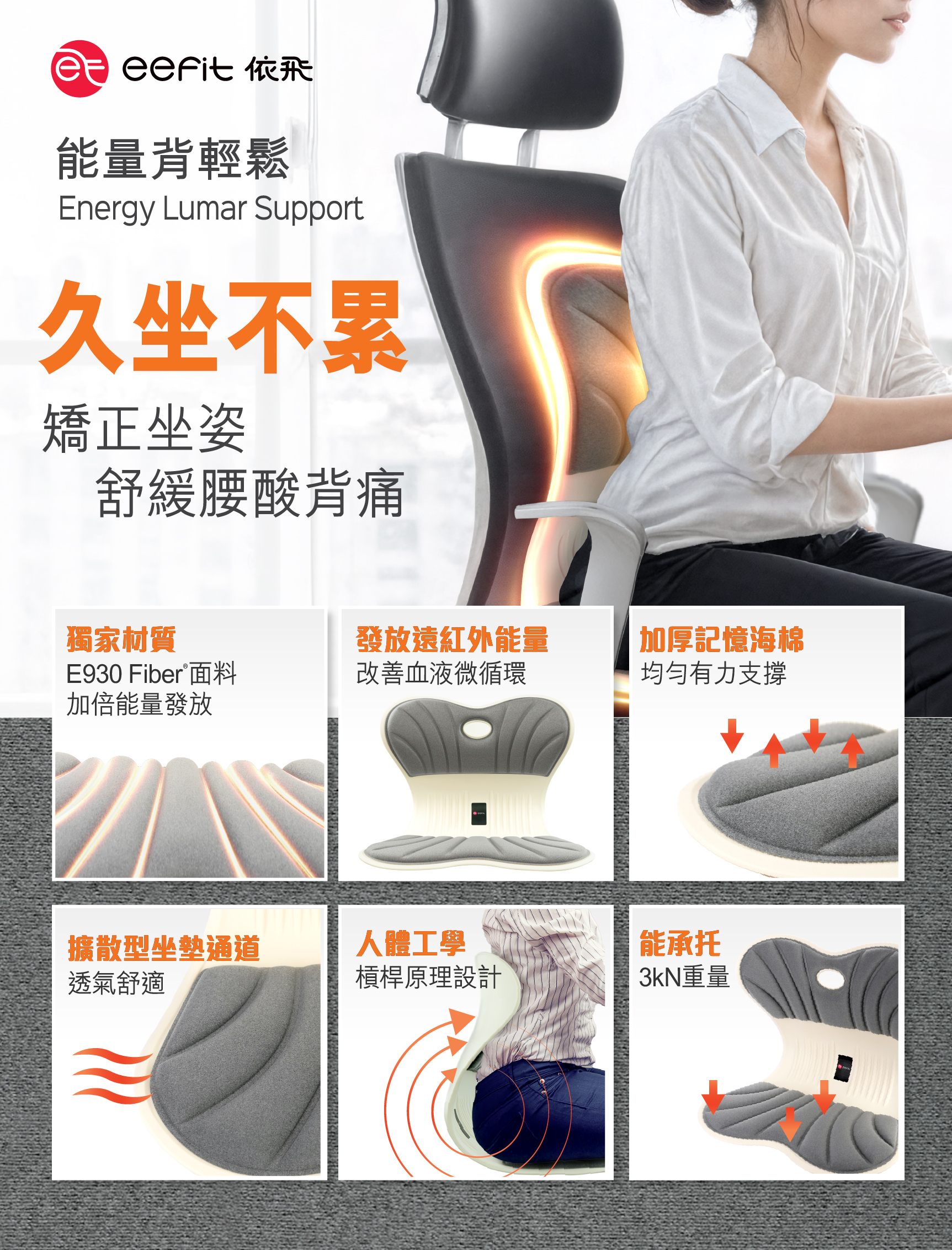 經 eefit 依飛專利科技導能,採用獨家研發物料E930 Fiber,本產品擁有更高的能量發放效果,倍增功效;其特別人體工學設計,有助矯正坐姿、減少坐姿不良及寒背等問題;特別加闊坐椅尺寸,全面包覆臀部,有助舒緩腰酸背痛,同時適合體寬人士;其擴散型坐墊通道,有助維持良好盆骨姿勢,減少脊椎及臀部疼痛。