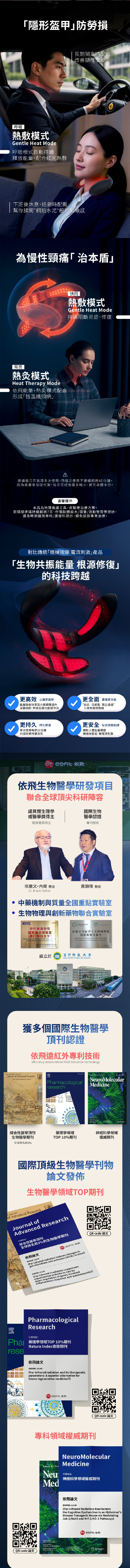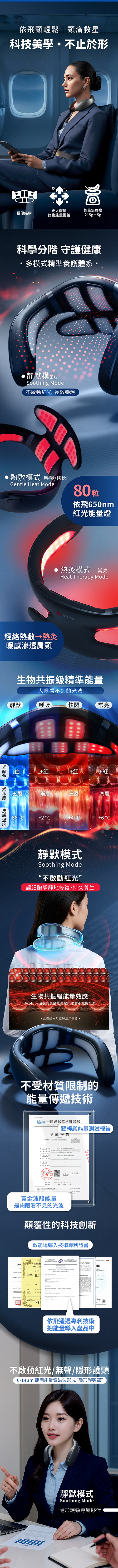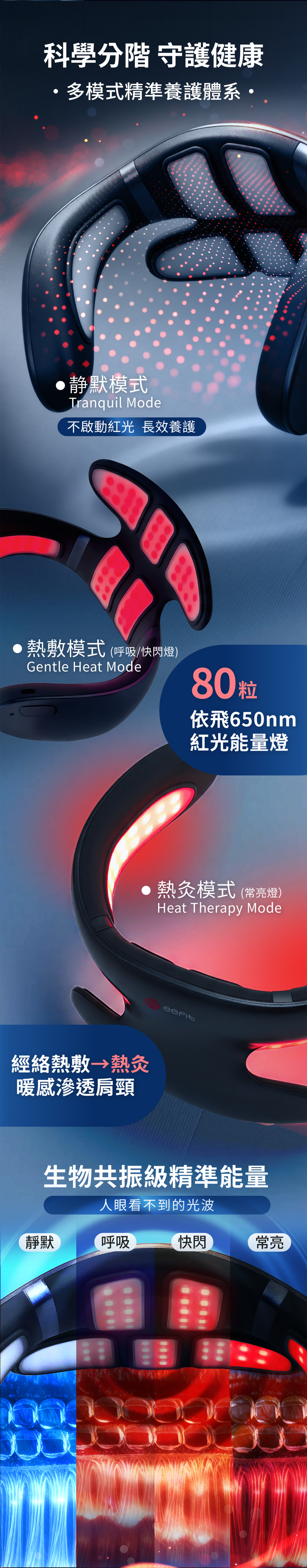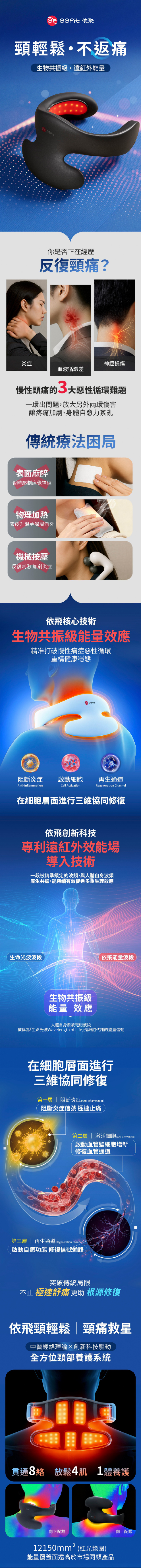 經 eefit 依飛專利科技導能,再配合80粒650nm依飛能量燈珠,使依飛能量高效滲透至肌肉組織。促進放鬆底層肌肉,疏通經絡,改善氣血循環,從根本緩解頸部不適;精準覆蓋肩頸肌群及重要穴位;2種不同穿戴方法 ,在改善六大困擾的同時,可額外針對改善不同問題;3大使用模式適合不同保健需求。
