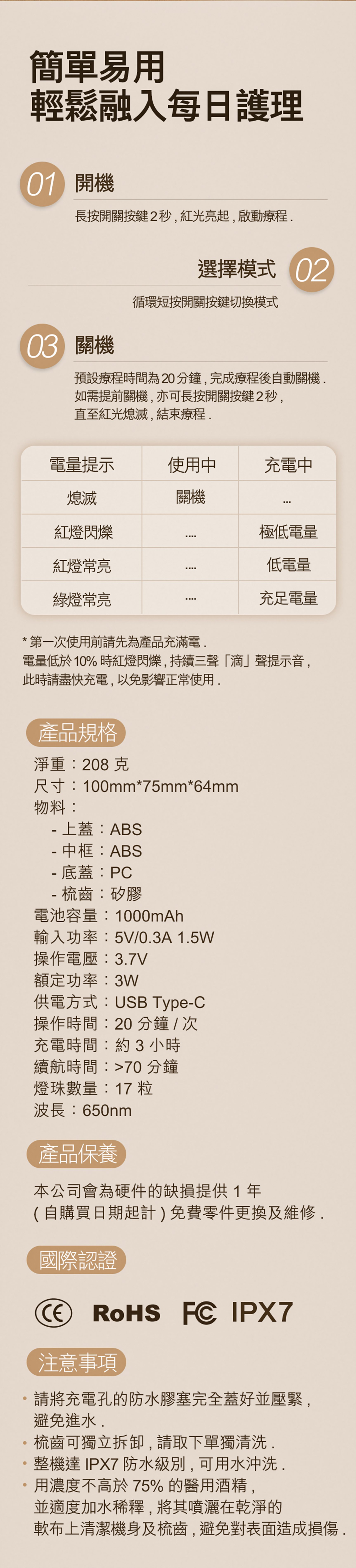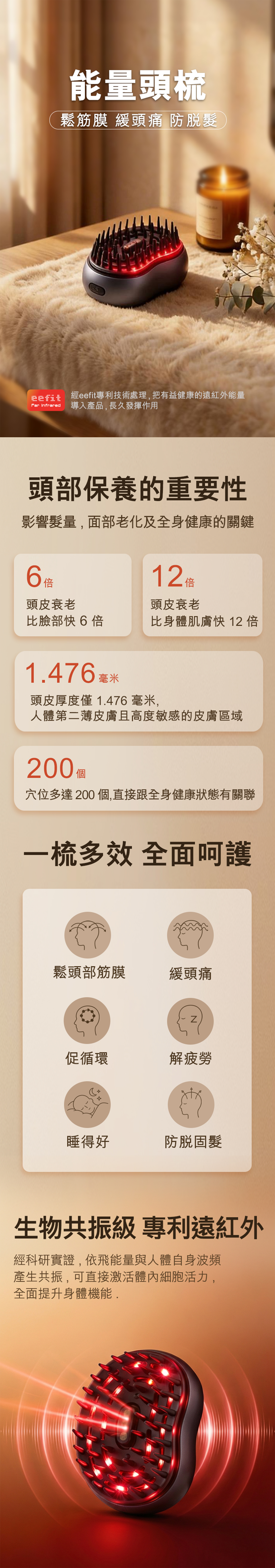 採用專利 eefit 遠紅外技術,精準釋放遠紅外線,深入頭皮底層,從根源改善頭皮環境,重塑髮絲健康。有效促進頭部微循環,放鬆頭皮筋膜,舒緩繃緊、腫脹與疲勞感;同時滋養毛囊,提升營養吸收效率,減少掉髮,激活自然生髮力。具備 IPX7 防水等級,乾濕兩用皆可安心使用。可拆式梳齒設計,清洗更方便,時刻保持潔淨衛生。人體工學手柄貼合手型,握感舒適穩固;機身輕巧便攜,讓日常頭皮護理更加輕鬆自如。