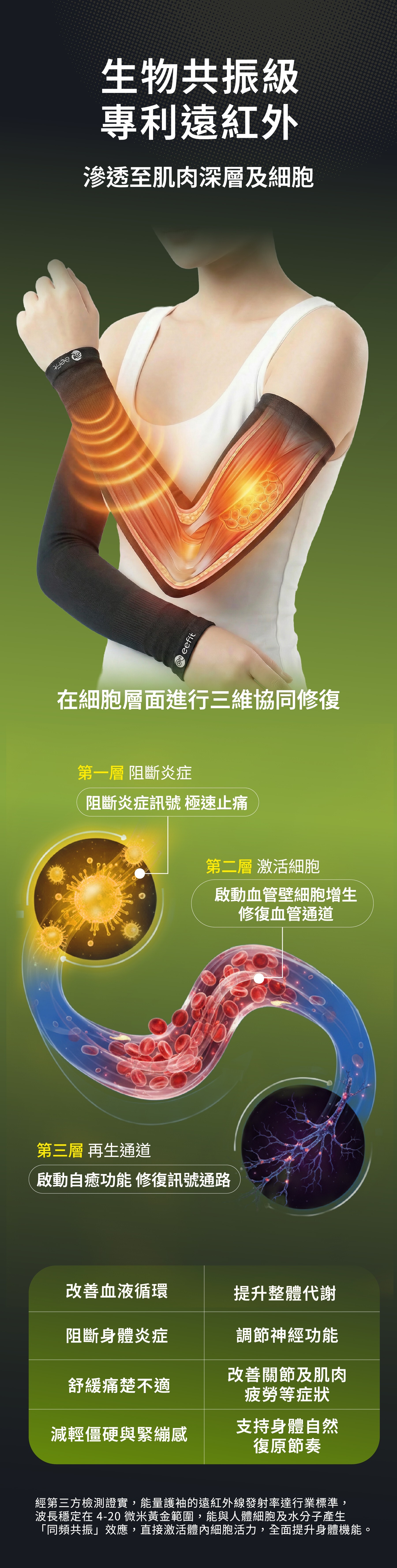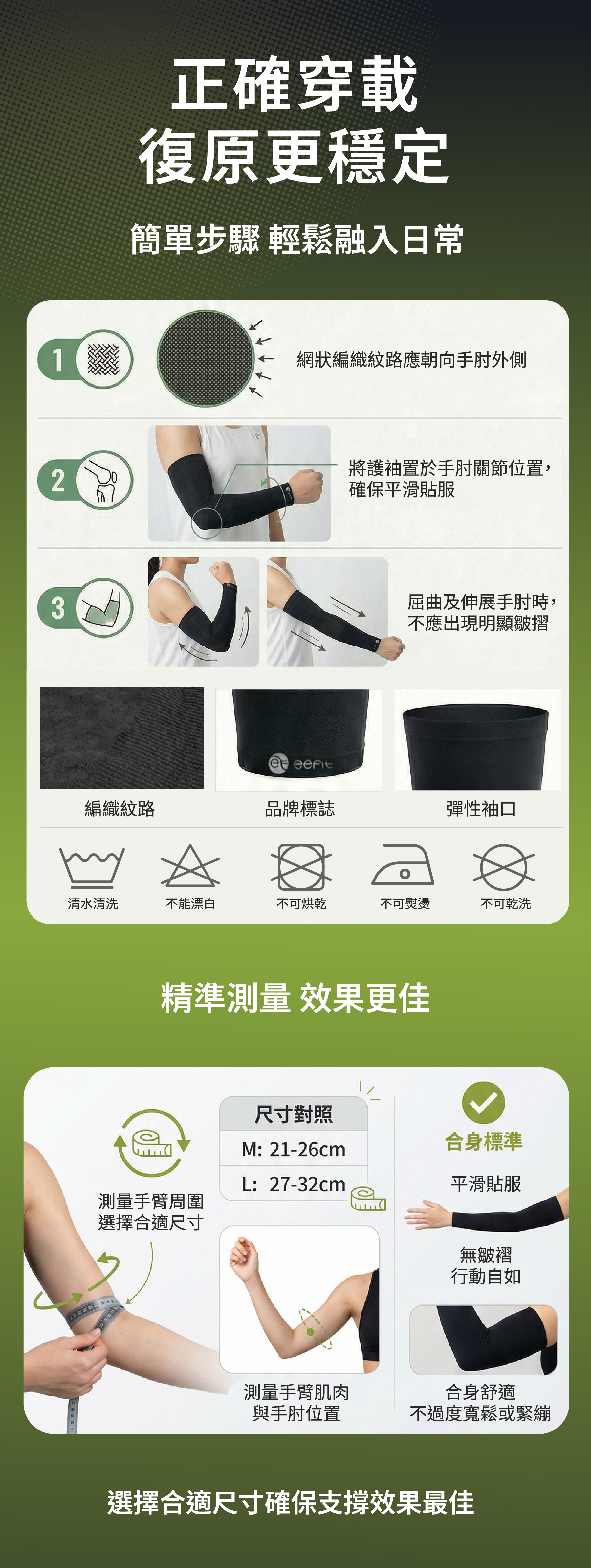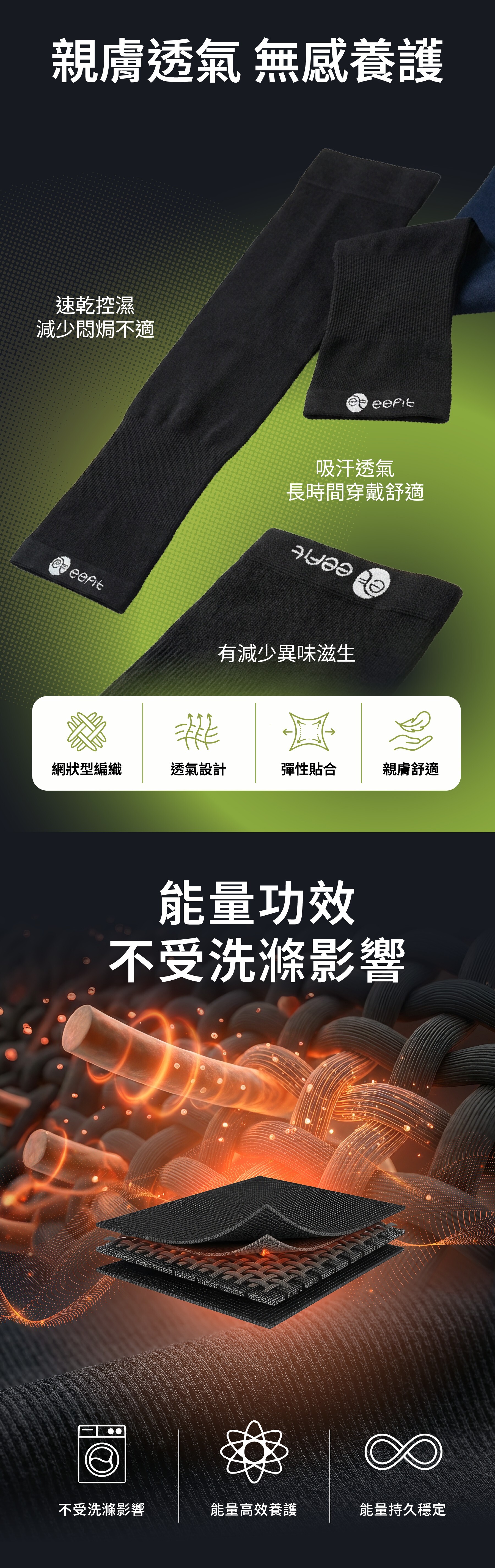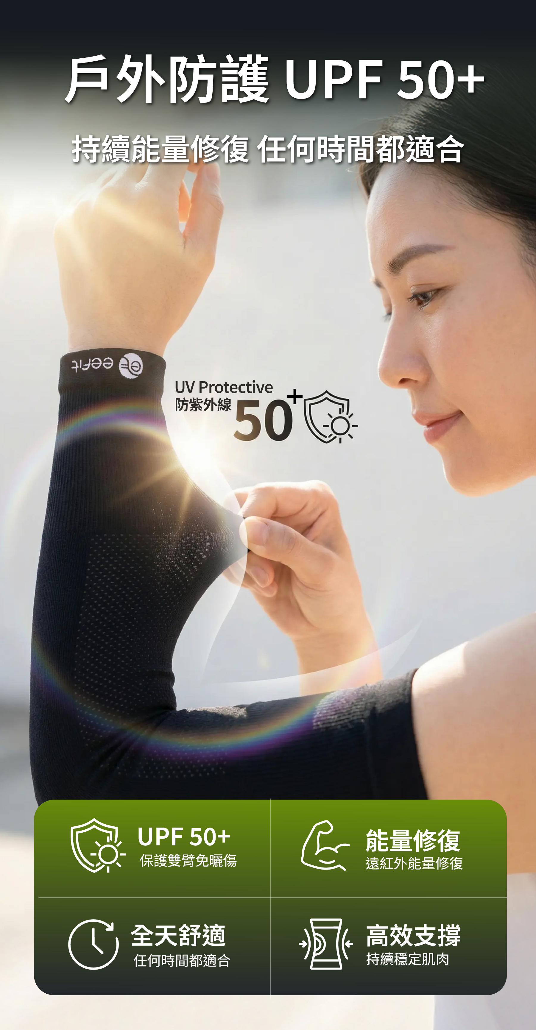 本產品以 eefit 依飛專利科技研發,配合獨家材質達致功能性護肘,改善關節不適及肌肉疲勞等症狀; 具有防紫外線50+功能,於戶外活動可避免雙臂曬傷。