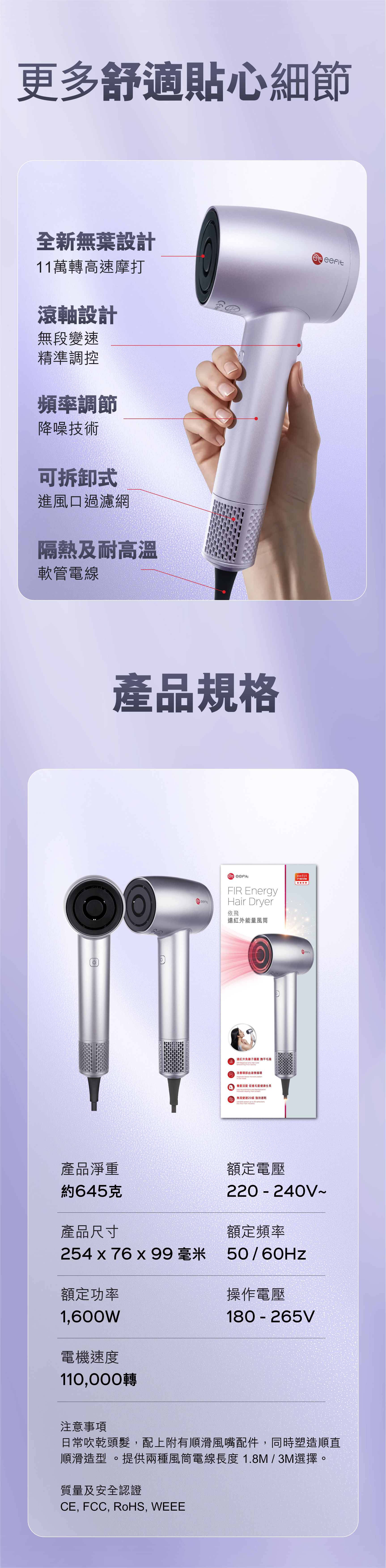 經eefit專利技術處理,改善身體血液微循環;風筒配備20級極細緻風速,適合全家所需;特設無段滾軸設計,快速精準調節風速;依飛遠紅外線科技與負離子技術相結合,達到雙重保養功效;11萬轉高速無刷摩打,迅速吹乾頭髮;一按切換冷暖熱風;高效疊加多項功能,達到多重活髮乾髮功效。
