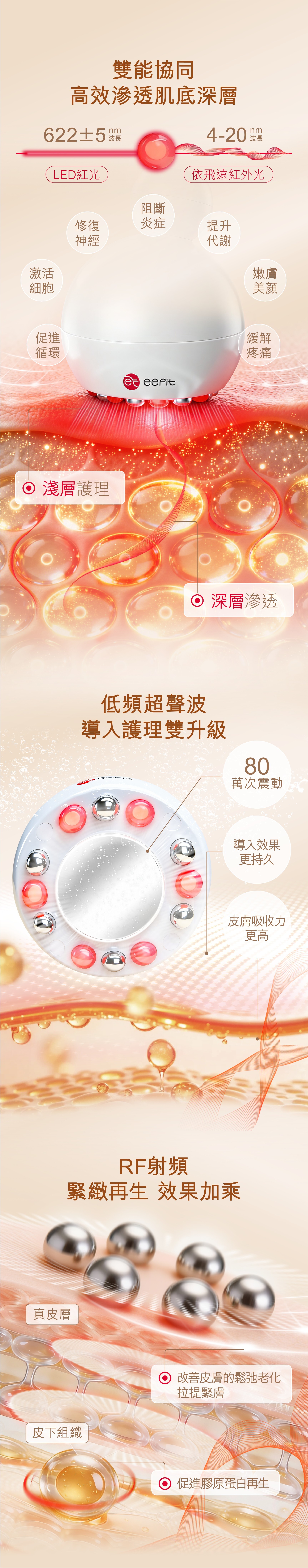 - RF射頻促進膠原再生,提升肌膚緊緻度及彈性