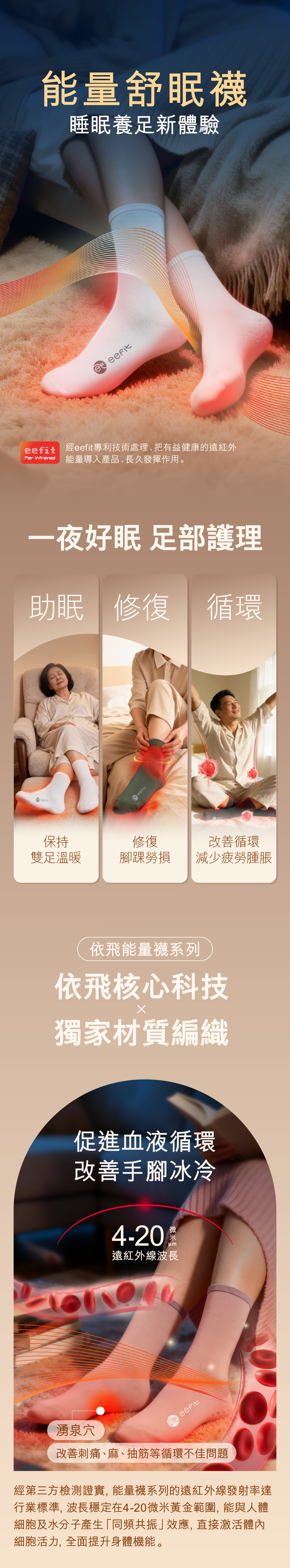 經 eefit 依飛專利科技導能,有效改善足部血液微循環,能量穩定及持久發放,即使經多次洗滌後亦不會影響發揮能量效果;其特別的中筒長度設計,能覆蓋到腳踝關節及不同的安神養顏穴位,保持雙腳溫暖,幫助入眠。