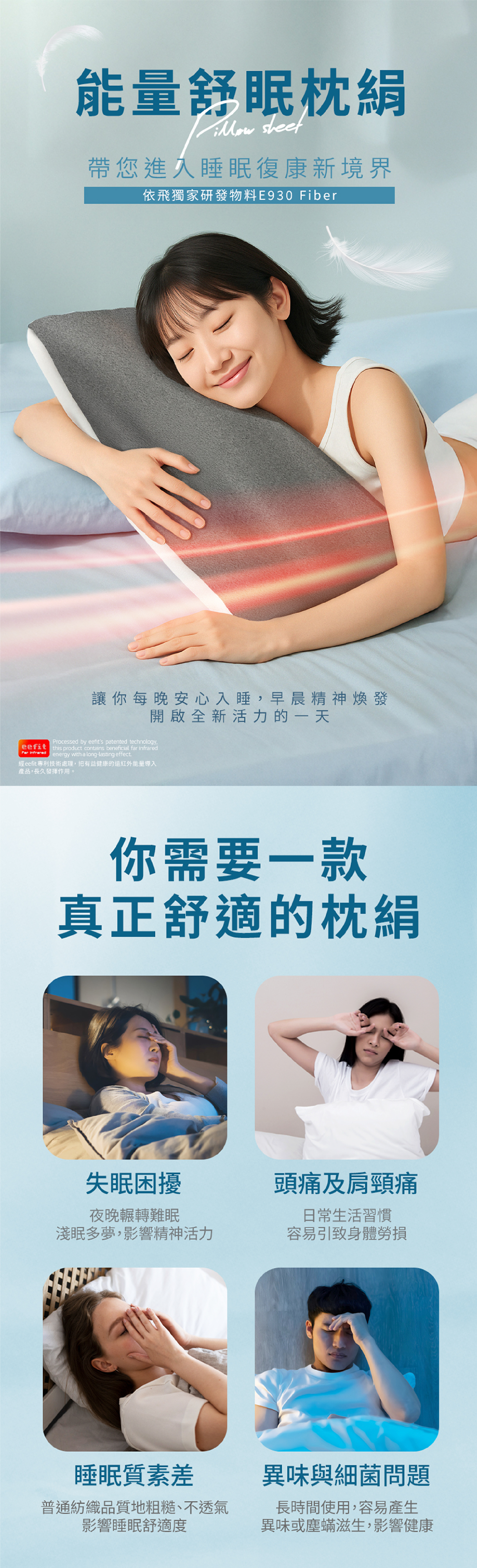 本產品以 eefit 依飛專利科技研發,提升睡眠質量而設計的枕頭,採用E930 Fiber材料及設計,促進頭部及頸部血液微循環,提供舒適的支持和放鬆的睡眠體驗。