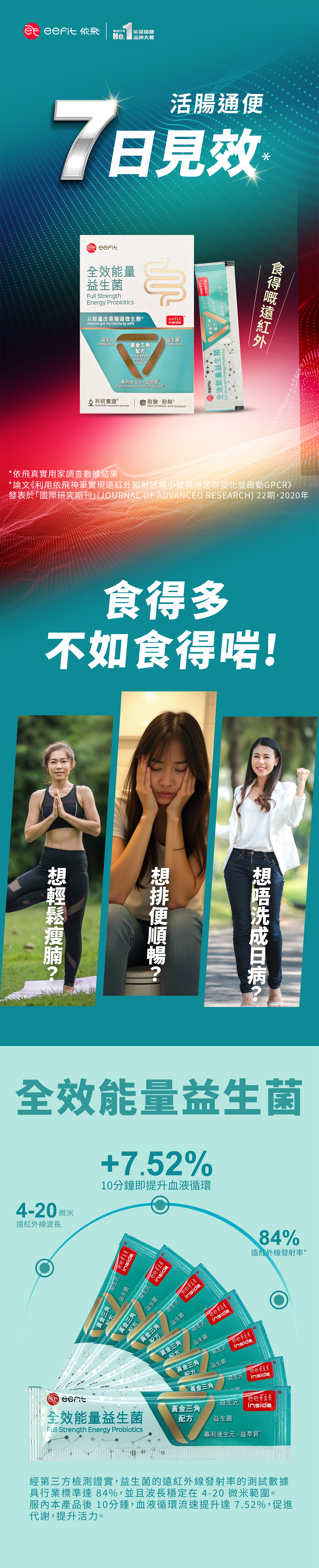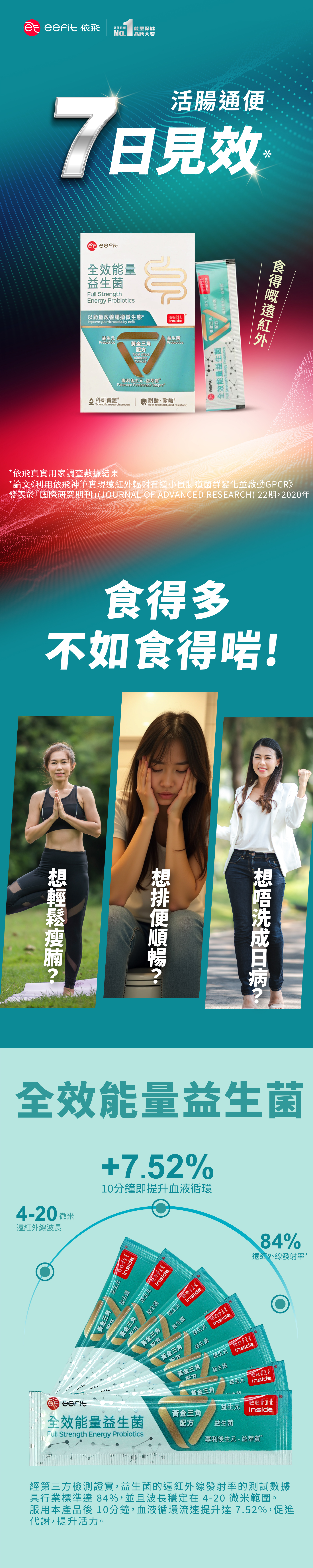 FDA認證,獨有黃金三角配方,含益生菌、益生元及專利後生元 - 益萃質®共同輔助,較單獨補充益生菌,更能有效調節腸道健康;同時產品導入依飛能量,與全效能量益生菌達到雙向調節作用,平衡腸道微生態,幫助消化並加強腸道吸收,從而增強免疫力。